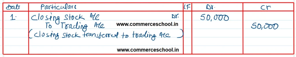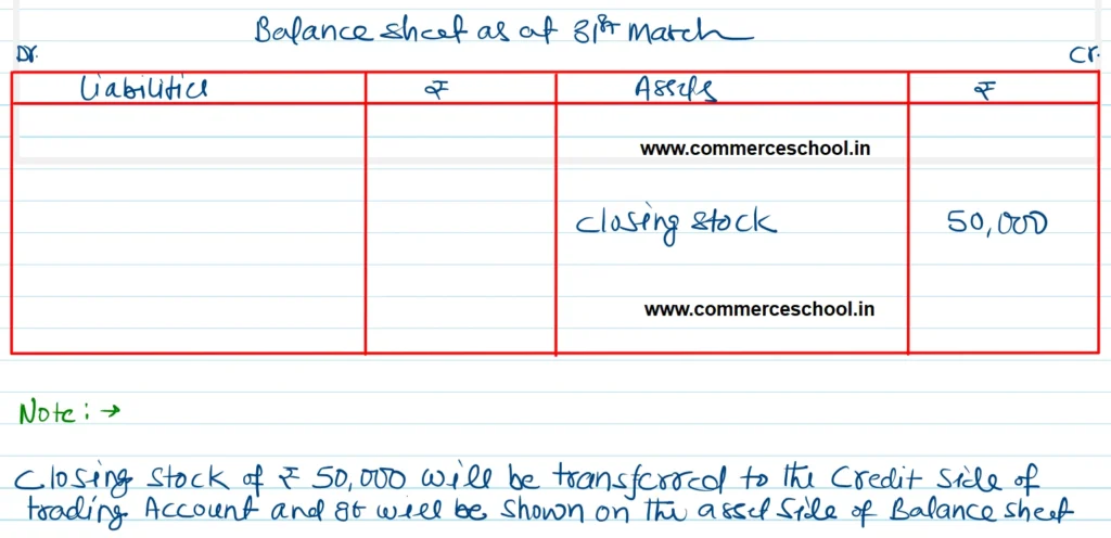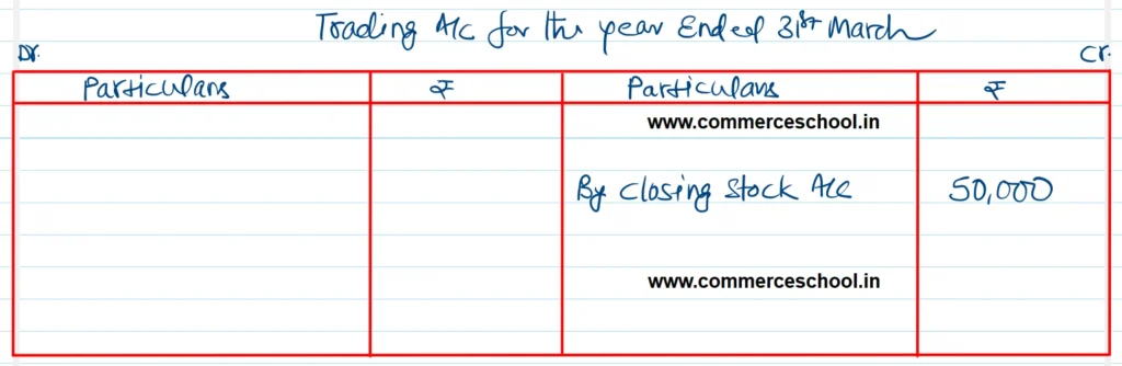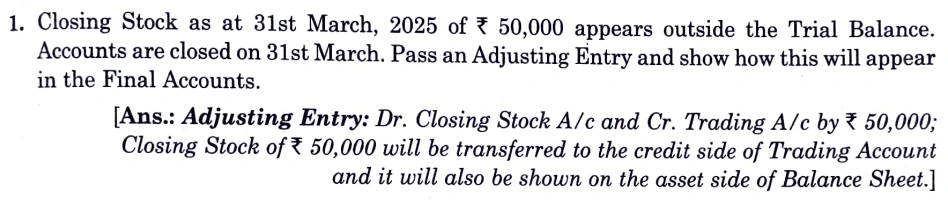 Closing Stock as at 31st March, 2025 of ₹ 50,000 appears outside the Trial Balance. Accounts are closed on 31st March. Pass an Adjusting Entry and show how this will appear in the Final Accounts.