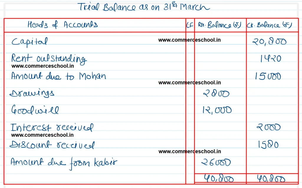Capital ₹ 20,800; Rent outstanding ₹ 1,420; Amount due to Mohan ₹ 15,000; Drawings ₹ 2,800; Goodwill ₹ 12,000; Interest received ₹ 2,000; Discount received ₹ 1,580; Amount due from Kabir ₹ 26,000.