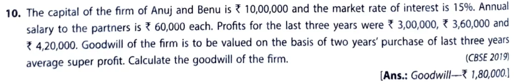 The Capital of the firm of Anuj and Benu is ₹ 10,00,000 and the market rate of interest is 15%. The annual salary of the partners is ₹ 60,000 each. The profit for the last three years were ₹ 3,00,000; ₹ 3,60,000 and ₹ 4,20,000. The goodwill of the firm is to be valued on the basis of two years’ purchase of the last three years’ average super profit. Calculate the goodwill of the firm.