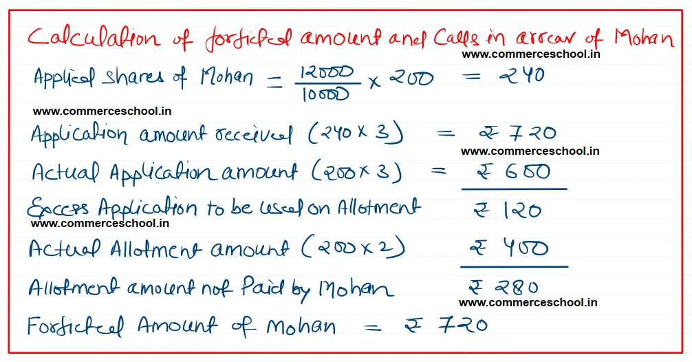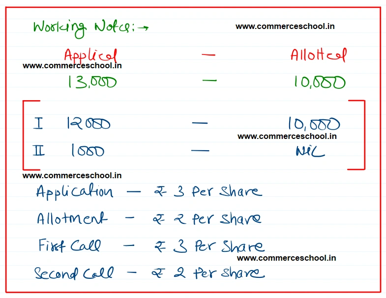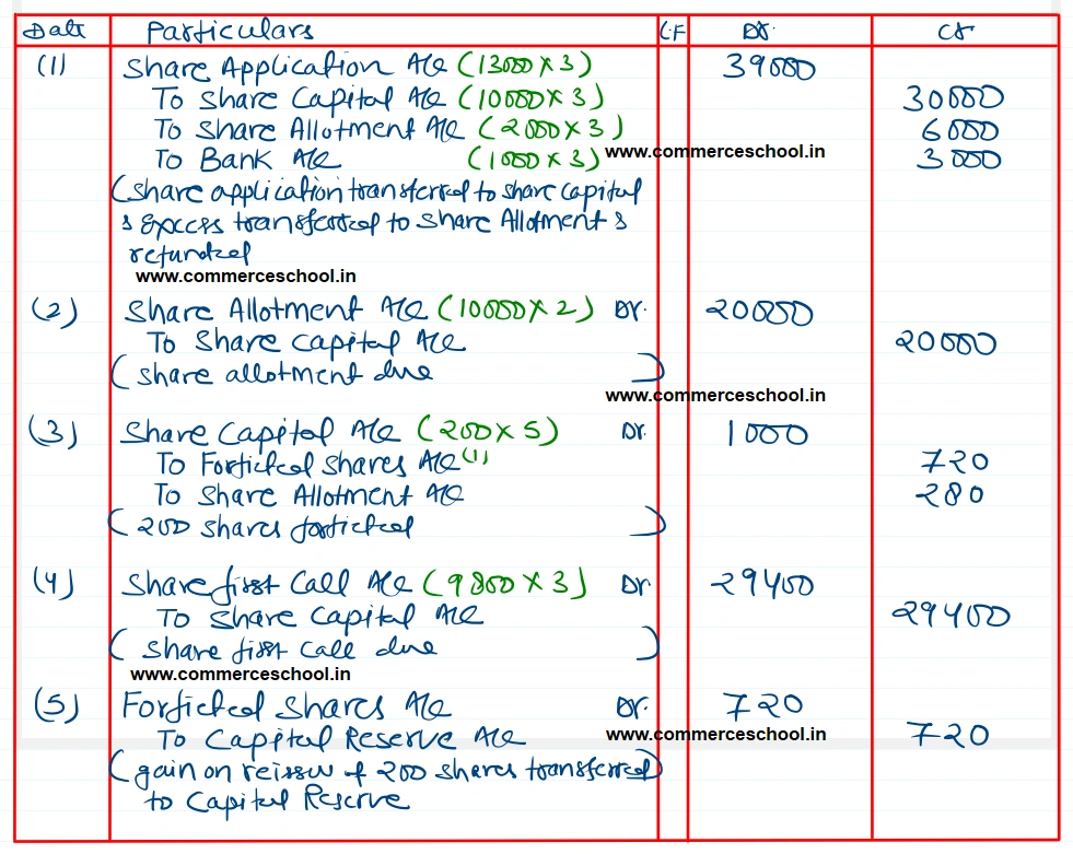 Visa Ltd. offered 10,000 shares of ₹ 100 each payable as follows: on application: ₹ 3, on allotment: ₹ 2, on first call: ₹ 3, on second call: ₹ 2. Public applied for 13,000 shares. Shares wre allotted on pro rata to the applicants of 12,000 shares. All the shareholders have paid the amount up to allotment except Mohan, the allottee of 200 shares. His shares were forfeited. First call was then made. Forfeited shares were reissued @ ₹ 9 per share, ₹ 8 called-up. Second call has not yet been made. You are required to make the Cash Book and Pass the Journal entries.