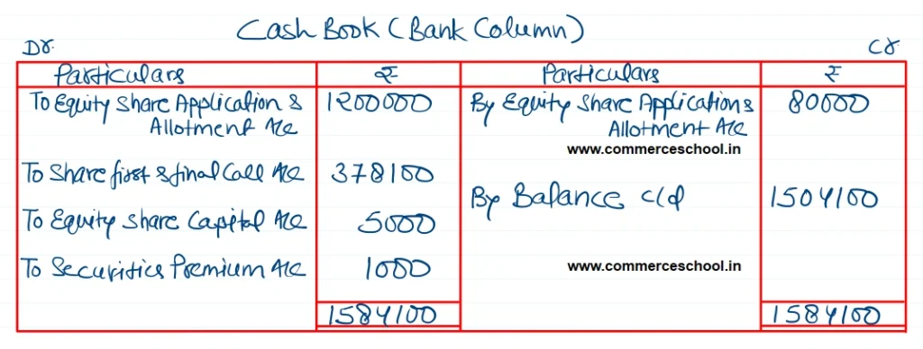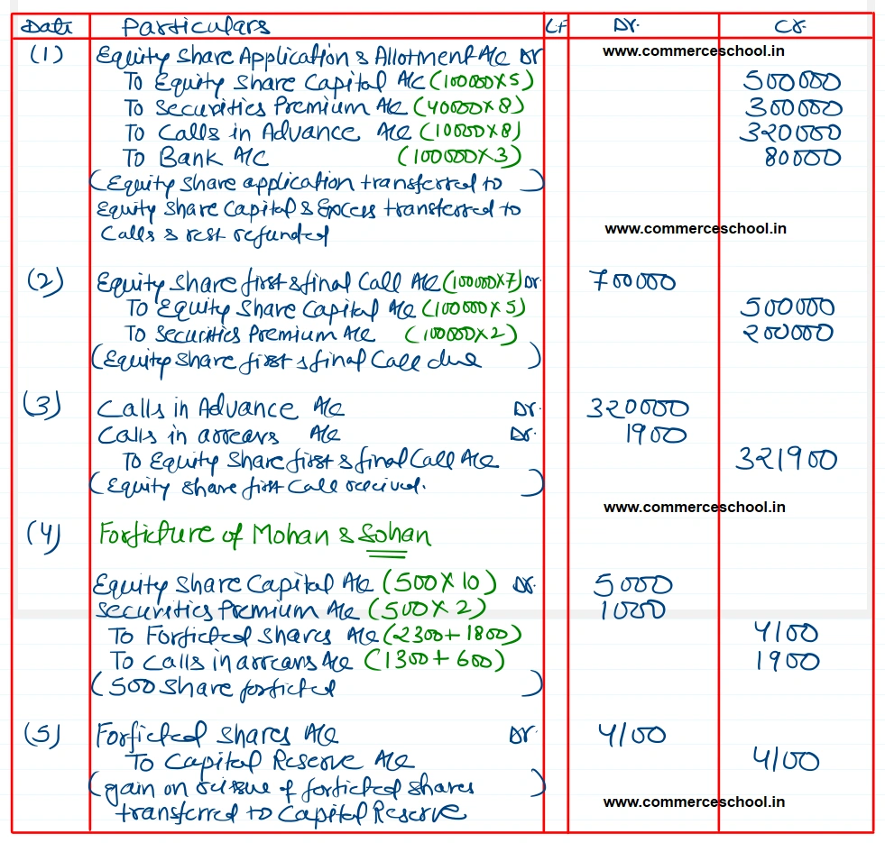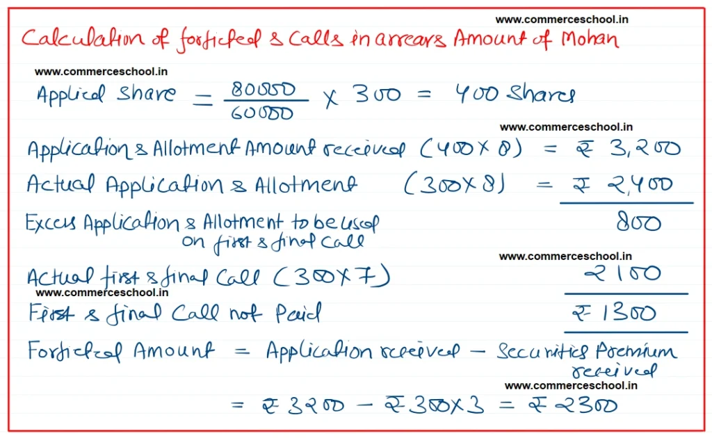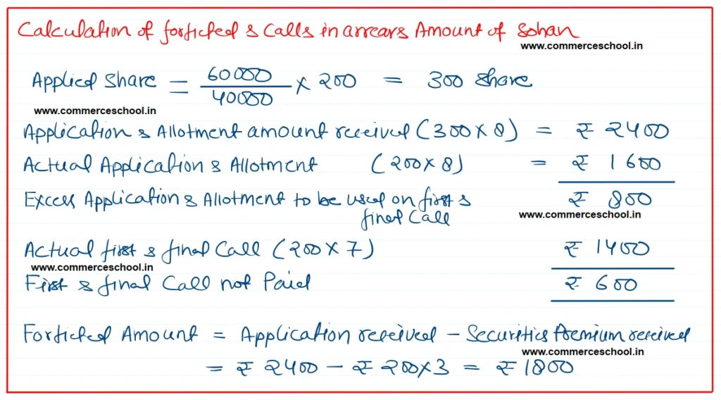[Ans.: No. of shares applied by Mohan 400, by Sohan 300; Call money due but not received from Mohan ₹ 1,300, from Sohan ₹ 600; Amount received at the time of call ₹ 3,78,100, Forfeited Shares Account credited by ₹ 4,100, Capital Reserve ₹ 4,100; Cash Book Balance – ₹ 15,04,100.]
