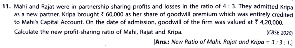 Mahi and Rajat were in partnership sharing profits and losses in the ratio of 4 : 3. They admitted Kripa as a new partner. Kripa brought ₹ 60,000 as her share of goodwill premium which was entirely credited to Mahi’s Capital Account. On the date of admission, goodwill of the firm was valued at ₹ 4,20,000. Calculate the new profit-sharing ratio of Mahi, Rajat, and Kripa.
