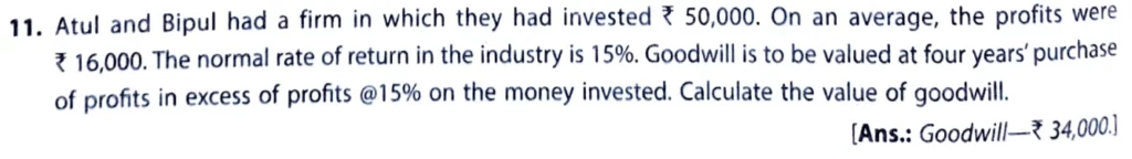 Atul and Bipul had a firm in which they had invested ₹ 50,000. On average, the profits were ₹ 16,000. The normal rate of return in the industry is 15%. Goodwill is to be valued at four years’ purchase of profits in excess of profits @ 15% on the money invested. Calculate the value of goodwill.