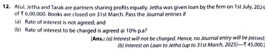Atul, Jetha, and Tarak are partners sharing profits equally. Jetha was given a loan by the firm on 1st July 2024 of ₹ 6,00,000. Books are closed on 31st March, What Journal entries will be passed if