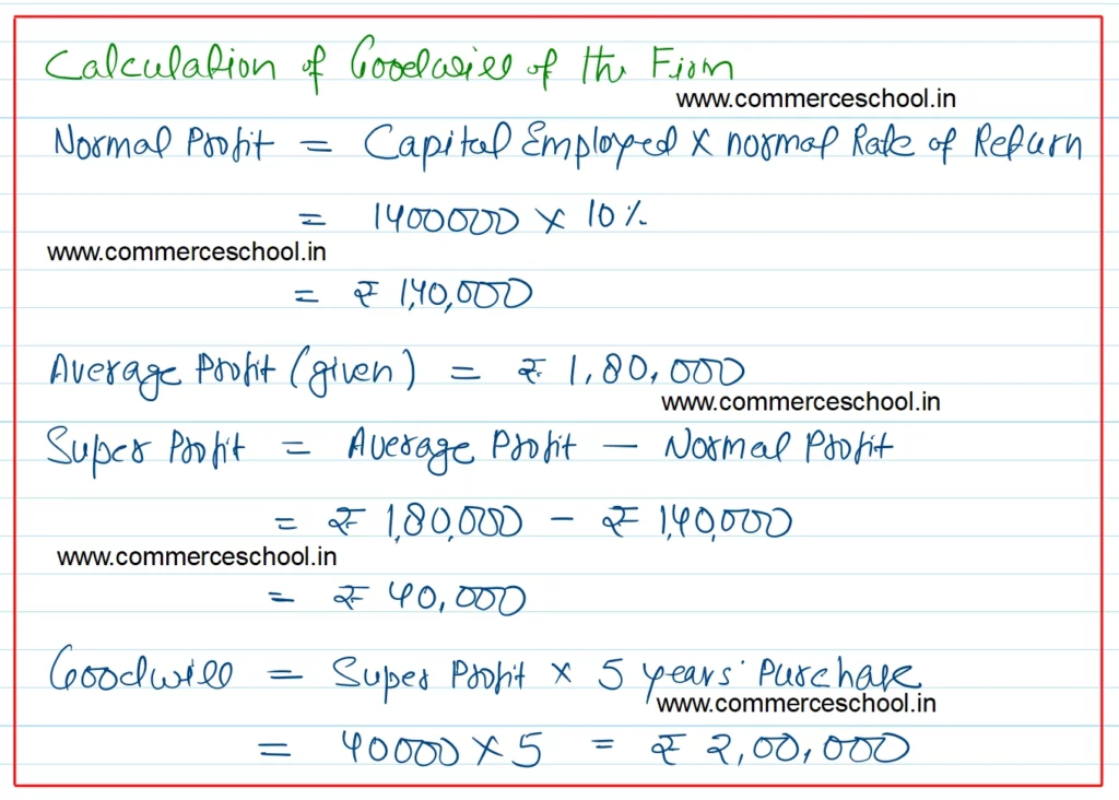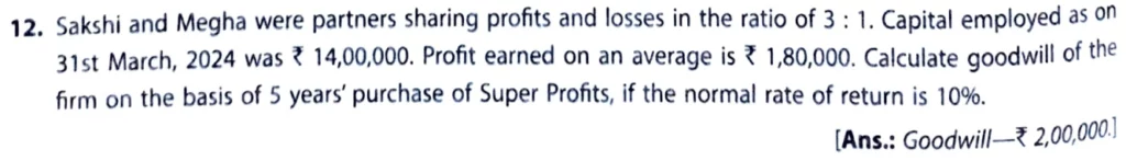 Sakshi and Megha were partners sharing profits and losses in the ratio of 3 : 1. Capital Employed as on 31st March, 2024 was ₹ 14,00,000. Profit earned on an average is ₹ 1,80,000. Calculate goodwill of the firm on the basis of 5 year’s of Super Profits, if the normal rate of return is 10%.