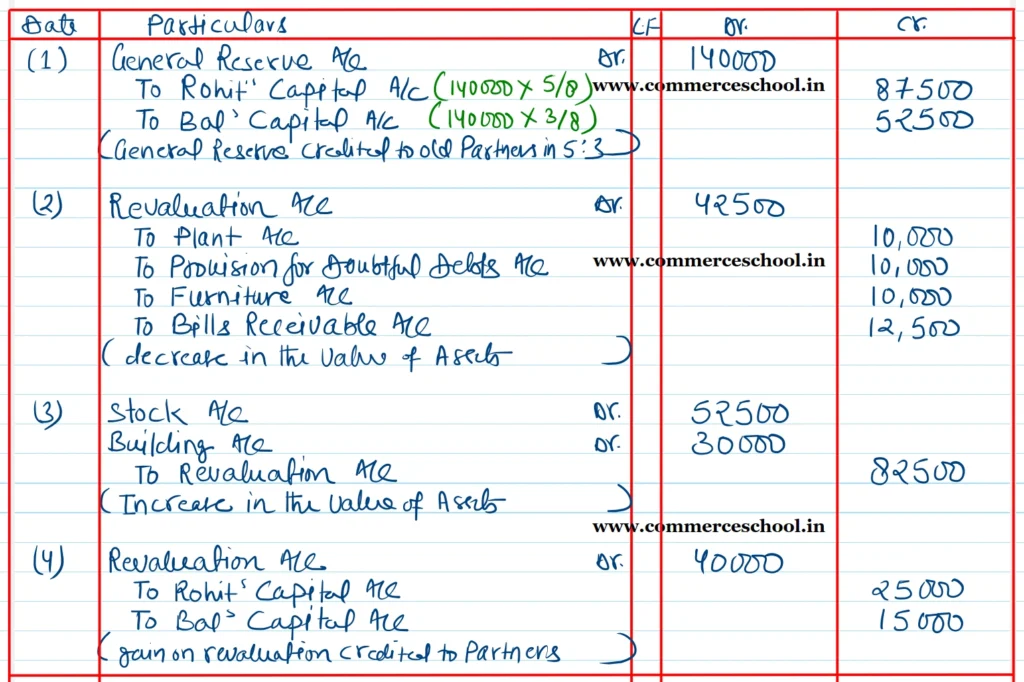 On April 1st, 2022, they decided to admit Khosla into the partnership giving him 1/5th share. He brings in ₹ 2,50,000 as his share of capital. The partners decide to revalue the Assets as follows: