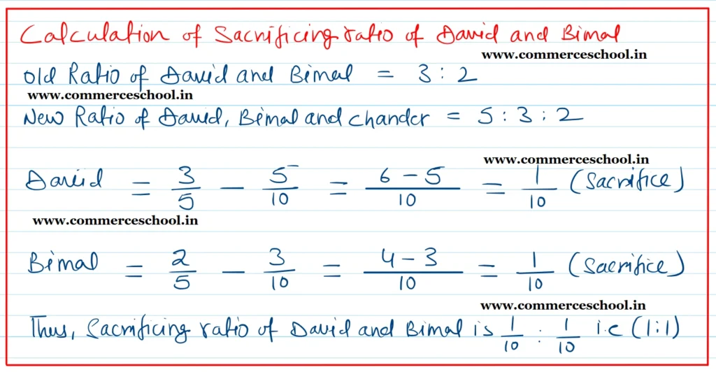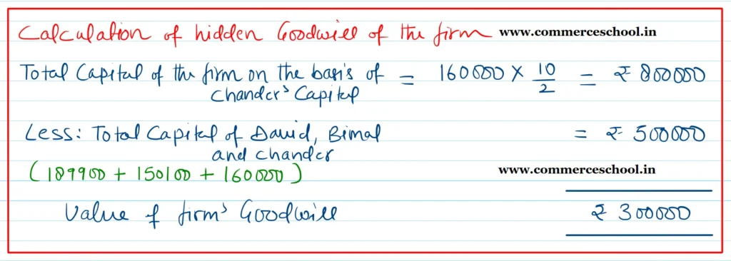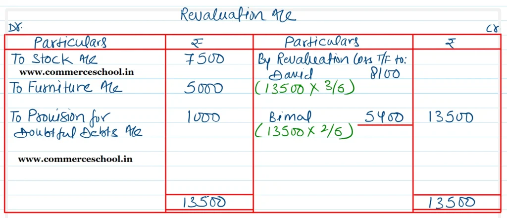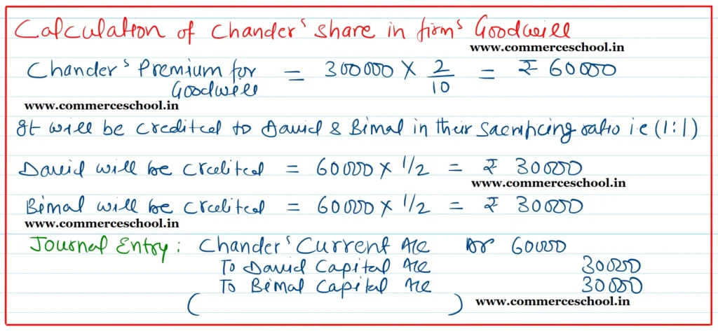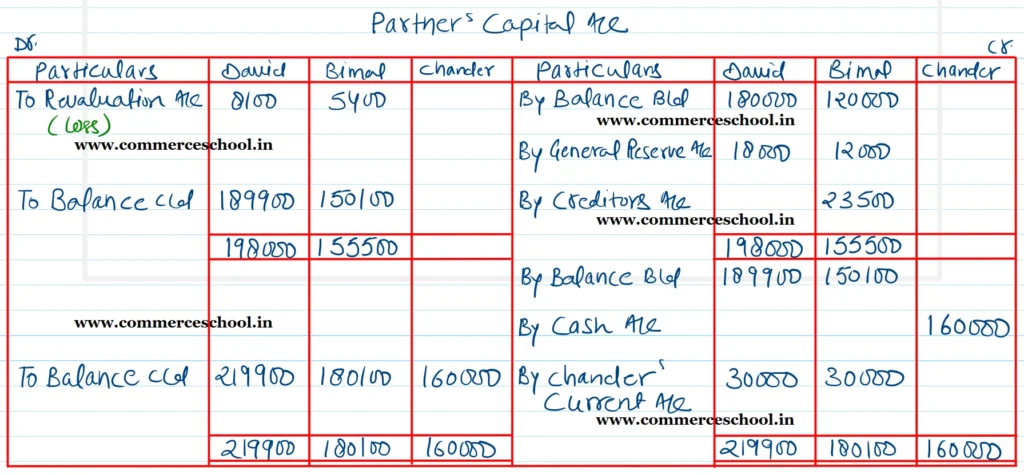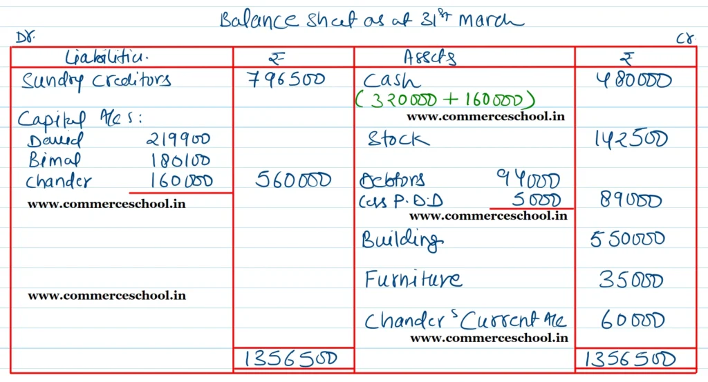 [Ans. Loss on Revaluation ₹ 13,500; Chander’s Current A/c (Dr.) ₹ 60,000; Capital Accounts: David ₹ 2,19,900; Bimal ₹ 1,80,100 and Chander ₹ 1,60,000; B/S total ₹ 13,56,500.]