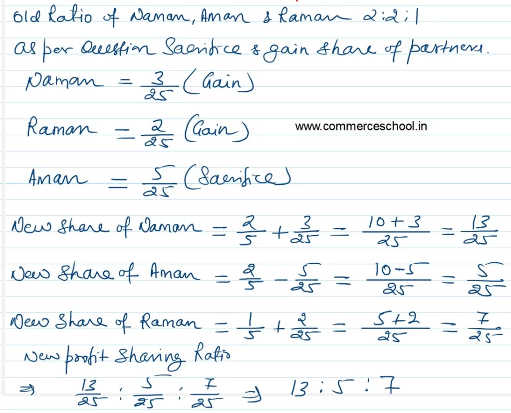 [Ans.: New Profit sharing Ratio – 13 : 7 : 5]