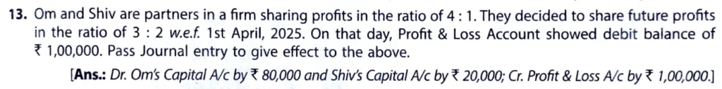 Om and Shiv are partners in a firm sharing profits in the ratio of 4 : 1. They decided to share future profits in the ratio of 3 : 2 w.e.f 1st April, 2023. On that day, the Profit and Loss Account showed a debit balance of ₹ 1,00,000. Pass Journal entry to give effect to the above.