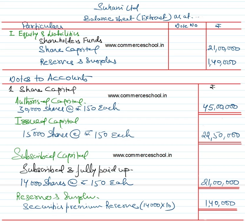 Prepare an extract of Balance Sheet of Suhani Ltd. as per Schedule III, Part I of the Companies Act, 2013 disclosing the share Capital.