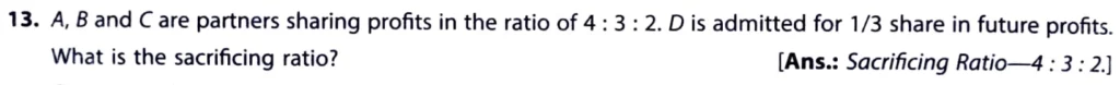 A, B and C are partners sharing profits in the ratio of 4 : 3 : 2. D is admitted for 1/3rd share in future profits. What is the sacrificing ratio?