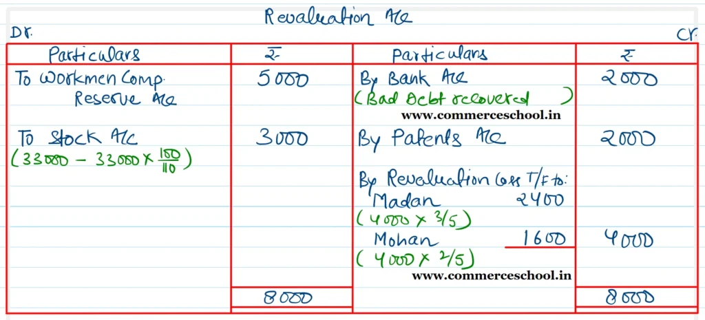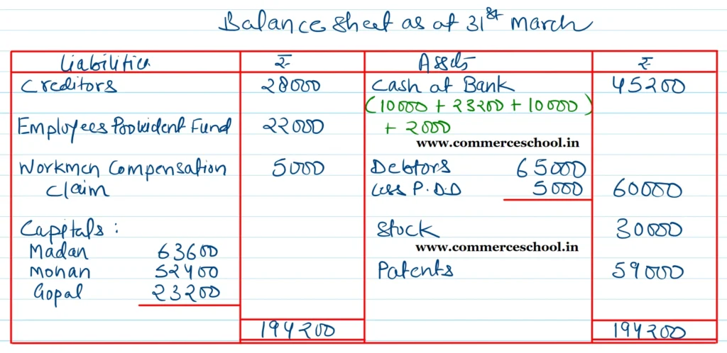 [Ans. Loss on Revaluation ₹ 4,000; Capitals : Madan ₹ 63,600; Mohan ₹ 52,400 and Gopal ₹ 23,200; Bank Balance ₹ 45,200; Balance Sheet Total ₹ 1,94,200.]