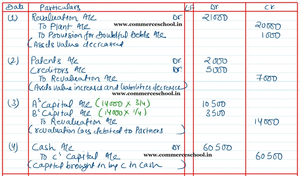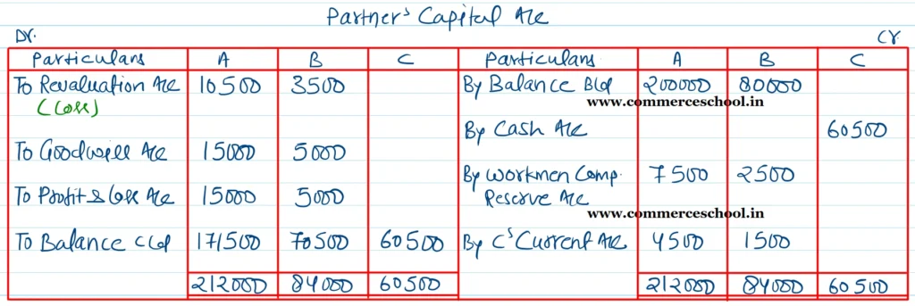 [Ans. Loss on Revaluation ₹ 14,000; Capital Accounts A ₹ 1,71,500; B ₹ 70,500 and C ₹ 60,500; C’s Current A/c (Dr.) ₹ 6,000; Cash Balance ₹ 78,500; B/S Total ₹ 3,67,500.]