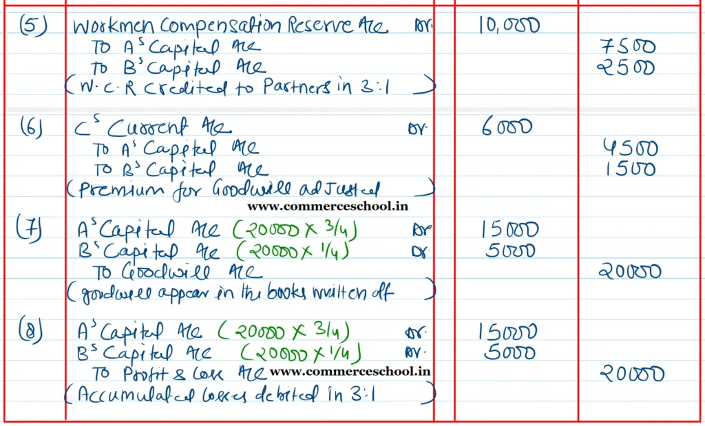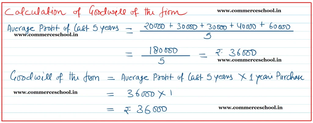(1) Goodwill is to be valued at one year’s purchase of the five year’s average profits which were ₹ 20,000; ₹ 30,000; ₹ 30,000; ₹ 40,000 and ₹ 60,000 respectively.