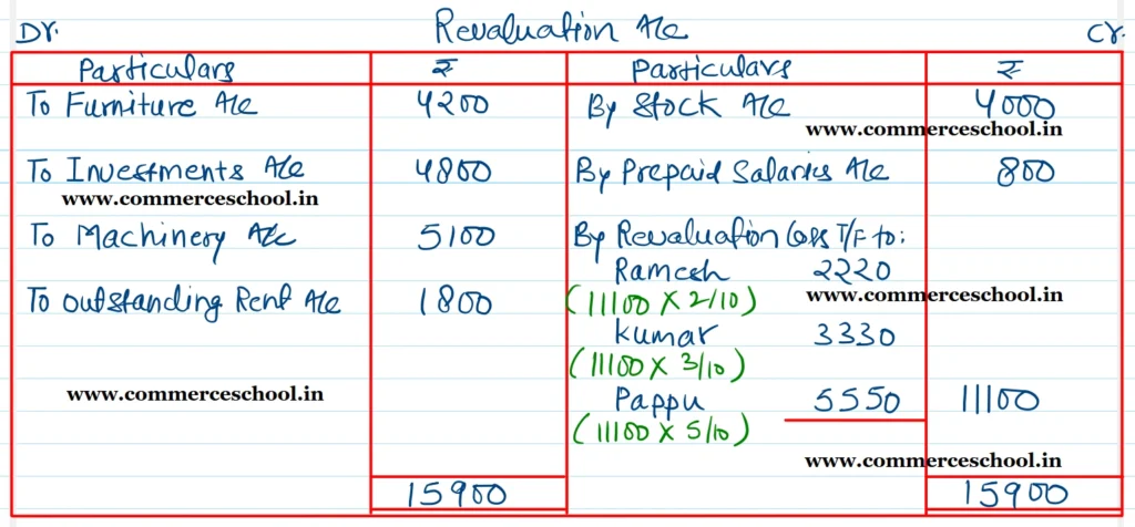 [Ans. Loss on Revaluation ₹ 11,100; Capital Accounts : Ramesh ₹ 32,000; Kumar ₹ 48,000; Pappu ₹ 80,000 and Shilpa ₹ 32,000; Cash Balance ₹ 95,100; B/S Total ₹ 2,89,800; Ramesh withdraws ₹ 5,780; Kumar brings in ₹ 1,330 and Pappu brings in ₹ 23,550.]