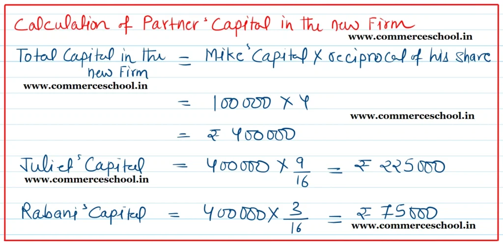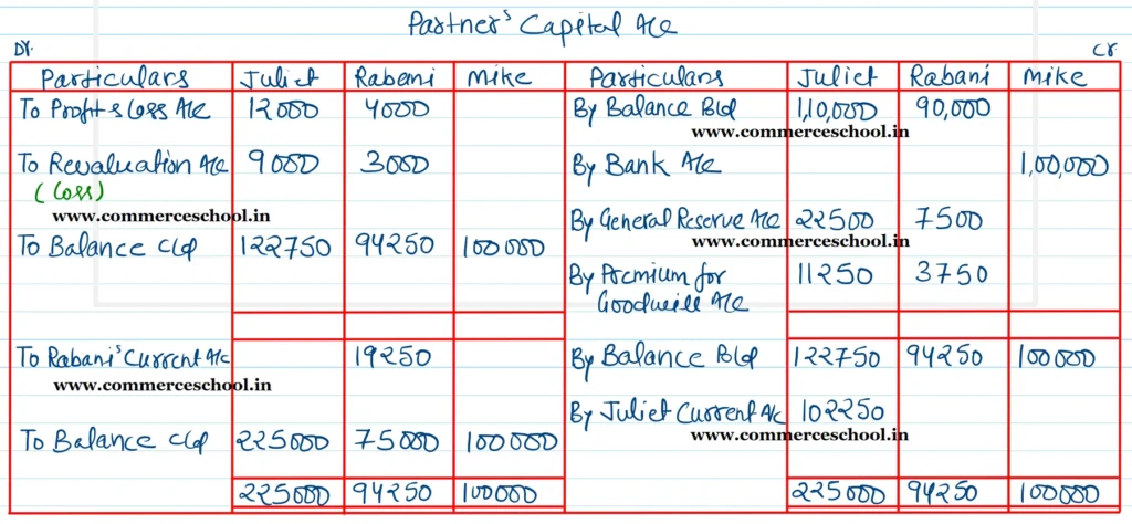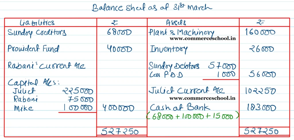 (e) Capital Accounts of juliet and Rabani were to be readjusted in the new profit sharing arragement on the basis of Mike’s capital, any surplus to be adjusted through current account and any deficiency through cash.