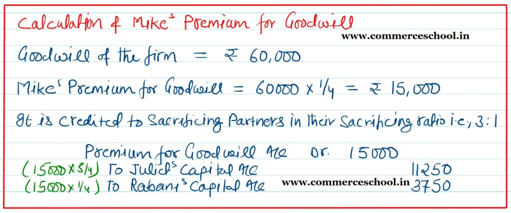 (d) Goodwill of the firm was valued at ₹ 60,000. Mike was to being in cash, his share of goodwill along with his capital of ₹ 1,00,000.