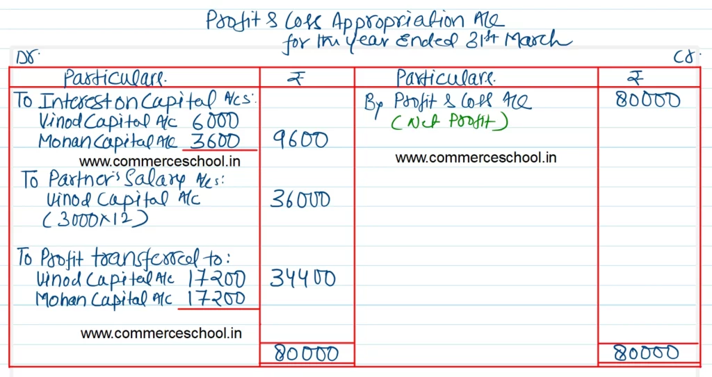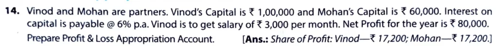 Vinod and Mohan are partners. Vinod’s Capital is ₹ 1,00,000 and Mohan’s Capital is ₹ 60,000. Interest on Capital is payable @ 6% p.a. Vinod is to get a salary of ₹ 3,000 per month. Net Profit for the year is ₹ 80,000.
