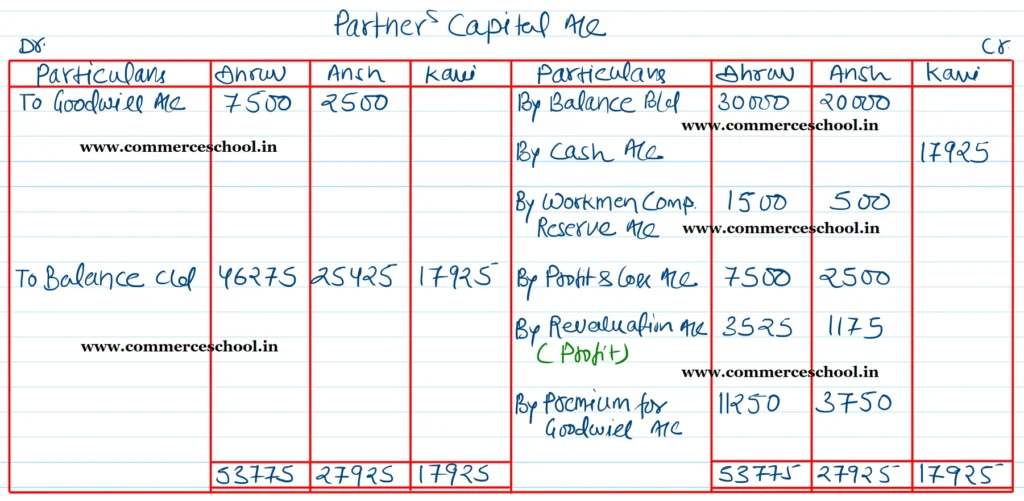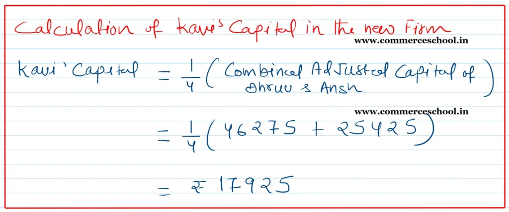 (vi) Kavi is to pay ₹ 15,000 to the existing partners as premium for Goodwill for 20% of the future profits of the firm. He is also to bring in capital equal to 1/4th of the combined capitals of Dhruv and Ansh.