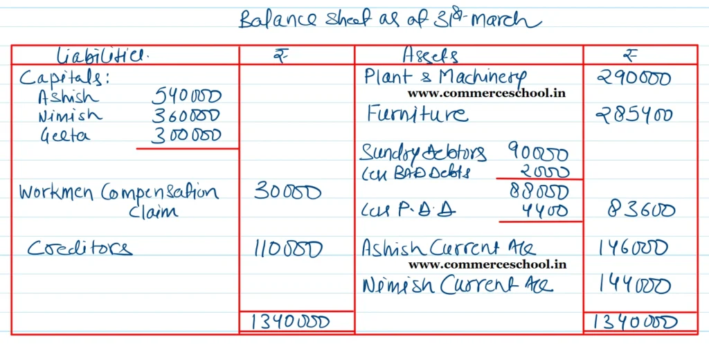 [Ans. Gain on Revaluation ₹ 40,000; Capital Accounts : Ashish ₹ 5,40,000; Nimish ₹ 3,60,000 and Geeta ₹ 3,00,000; Current Accounts : Ashish (Dr.) ₹ 1,46,000 and Nimish (Dr.) ₹ 1,44,000. Balance Sheet Total ₹ 13,40,000.]