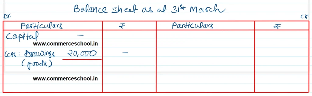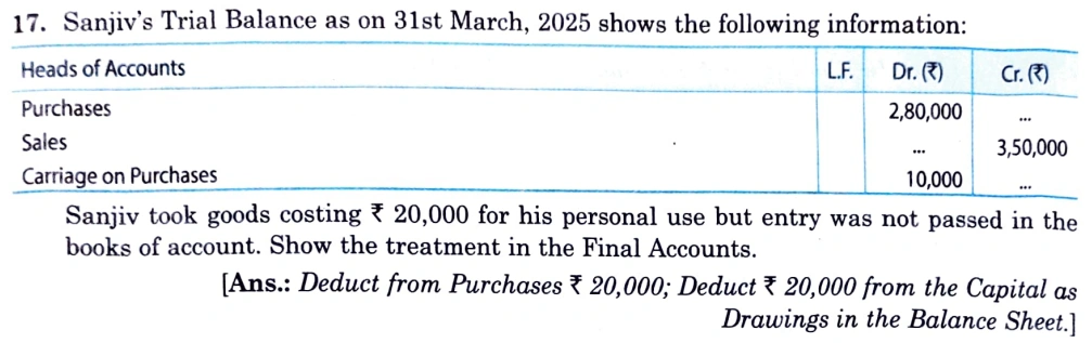 Sanjiv took goods costing ₹ 20,000 for his personal use but entry was not passed in the books of account. Show the treatement in the Final Accounts.