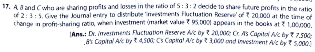 A, B and C who are sharing profits and losses in the ratio of 5 : 3 : 2 decide to share future profits in the ratio of 2 : 3 : 5. Give the Journal entry to distribute ‘Investments Fluctuation Reserve’ of ₹ 20,000 at the time of change in profit sharing ratio, when investment (market value ₹ 95,000) appears in the books at ₹ 1,00,000.