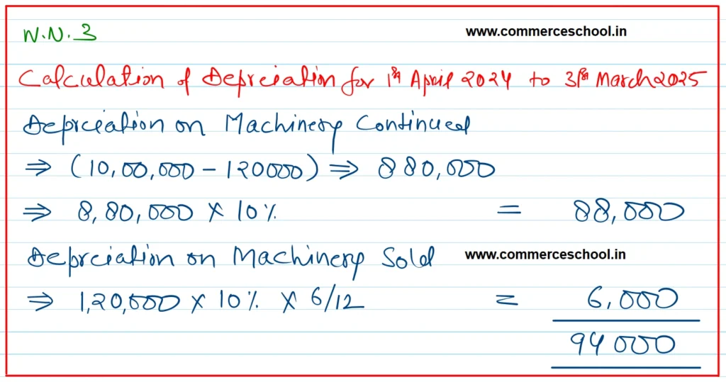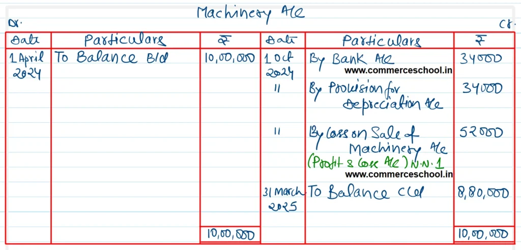 Depreciatoin is provided at 10% per annum on the original cost on 31st March every year. On 1st October, 2024, a machine which was purchased on 1st December, 2021 for ₹ 1,20,000 was sold for ₹ 34,000.