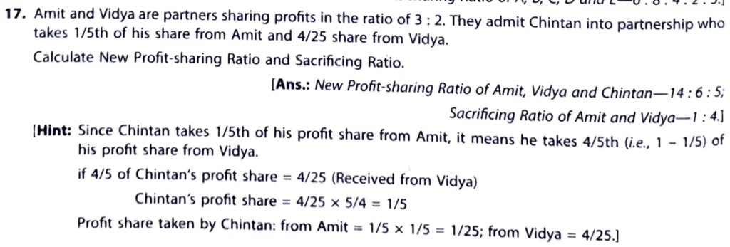 Amit and Vidya are partners sharing profits in the ratio of 3 : 2. They admit Chintan into partnership who acquires 1/5th of his share from Amit and 4/25th share from vidya. Calculate New Profit sharing ratio and Sacrificing Ratio.