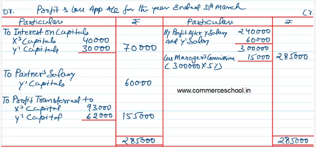 [Ans: Provision for Manager’s Commission – ₹ 15,000 (i.e., 5% of ₹ 3,00,000), Share of Profit: X – ₹ 93,000; Y – ₹ 62,000.]