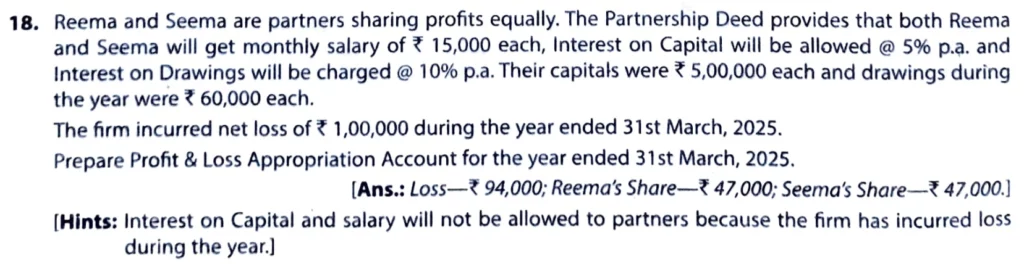 [Ans: Loss – ₹ 94,000; Reema’s Share – ₹ 47,000; Seema’s Share – ₹ 47,000.]