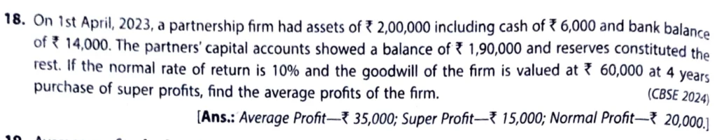 On 1st April, 2023, a partnership firm had assets of ₹ 2,00,000 including cash of ₹ 6,000 and bank balance of ₹ 14,000. The partner’s capital accounts showed a balance of ₹ 1,90,000 and reserves constituted the rest. If the normal rate of return is 10% and the goodwill of the firm is valued at ₹ 60,000 at 4 years purchase of super profits, find the average profits of the firm.