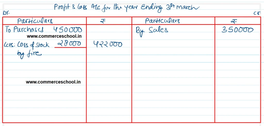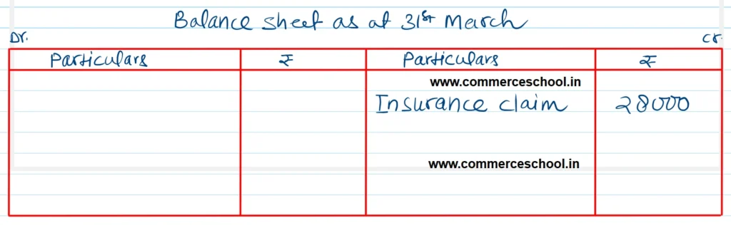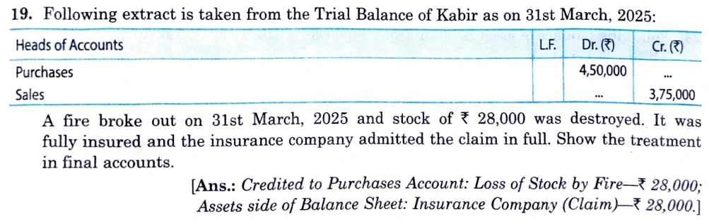 A fire broke out on 31st March, 2025 and stock of ₹ 28,000 was destroyed. Itwas fully insured and the insurance company admitted the claim in full. Show the treatment in final accounts.