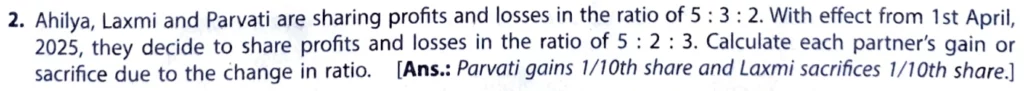 Ahilya, Laxmi and Parvati are sharing profits and losses in the ratio of 5 : 3 : 2. With effect from 1st April, 2024, they decide to share profits and losses in the ratio of 5 : 2 : 3. Calculate each partner’s gain or sacrifice due to change in ratio.