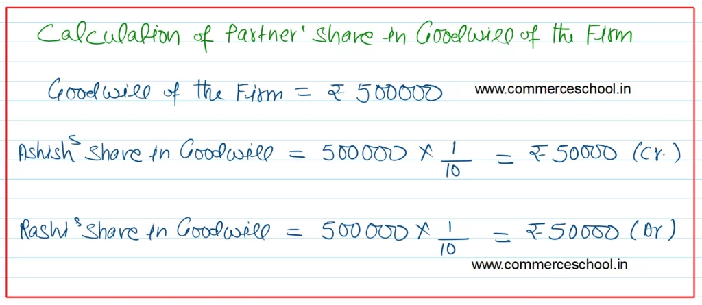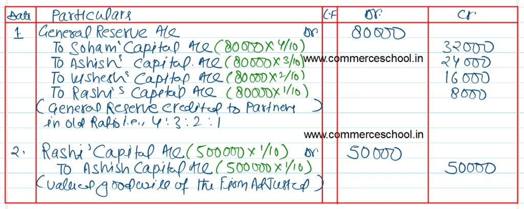 Soham, Ashish, Vishesh and Rashi were partners in a firm sharing profits and losses in the ratio of 4 : 3 : 2 : 1. with effect from 1st April, 2023, they decided to share profits and losses in the ratio of 2 : 1 : 1 : 1. Their Balance Sheet showed a General Reserve of ₹ 8,000. The goodwill of the firm was valued at ₹ 5,00,000.