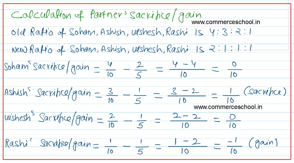 [Ans.: (i) Dr. General Reserve A/c by ₹ 80,000; Cr. Soham’s Capital A/c by ₹ 32,000; Ashish’s Capital A/c by ₹ 24,000; Vishesh’s Capital A/c by ₹ 16,000; Rashi’s Capital A/c by ₹ 8,000. (ii) Dr. Rashi’s Capital A/c and Cr. Ashish’s Capital A/c by ₹ 50,000 (₹ 5,00,000 x 1/10). Soham’s Sacrifice/Gain = Nil; Ashish’s Sacrifice = 1/10; Vishesh’s Sacrifice/Gain = Nil; Rashi’s Gain = 1/10.]