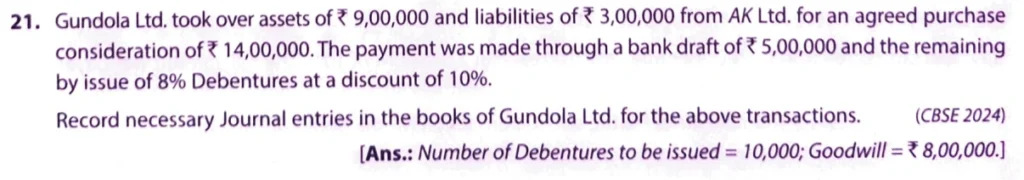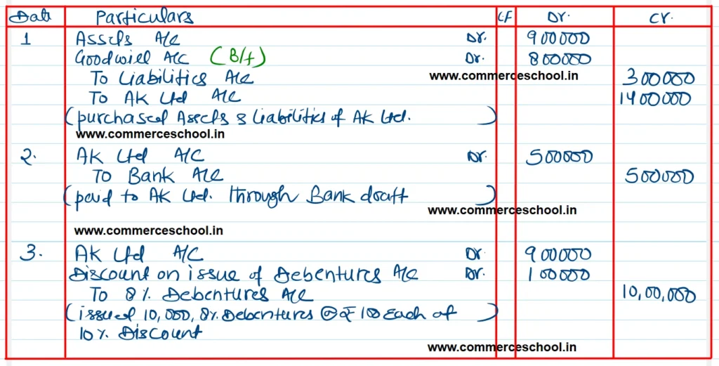 Gundola Ltd. took over assets of ₹ 9,00,000 and liabilities of ₹ 3,00,000 from AK Ltd. for an agreed purchase consideration of ₹ 14,00,000. The payment was made through a bank draft of ₹ 5,00,000 and the remaining by issue of 8% Debentures at a discount of 10%.