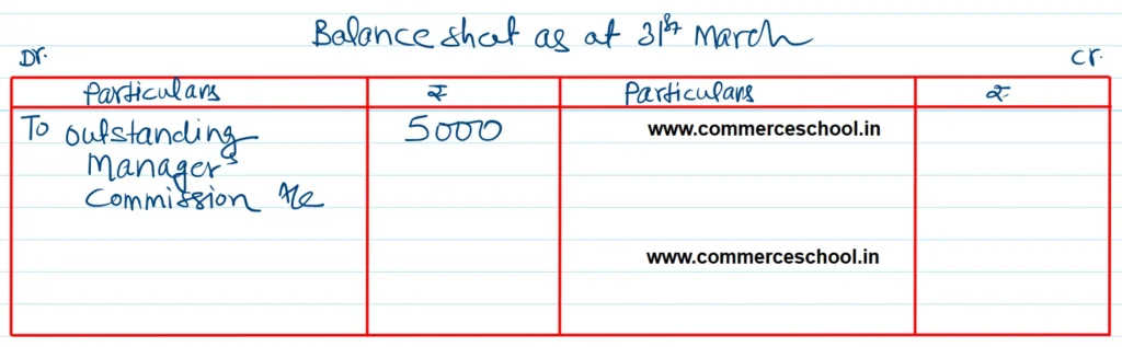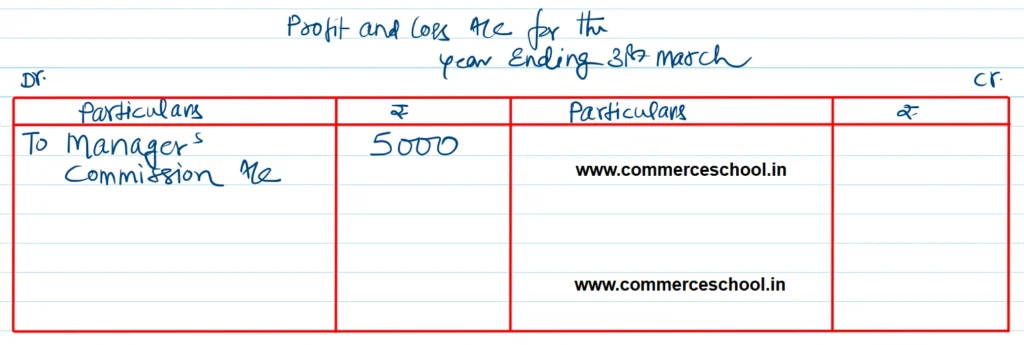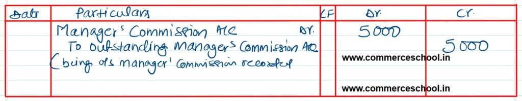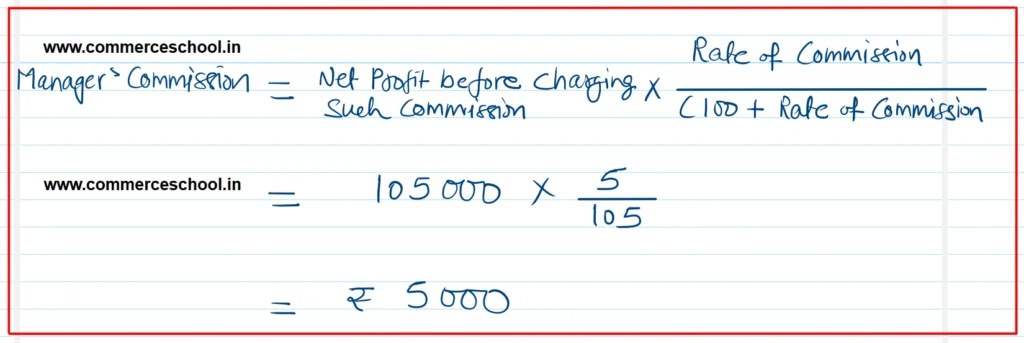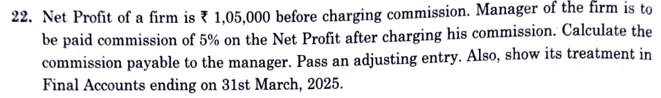 Net Profit of a firm is ₹ 1,05,000 before charing commission. Manager of the firm is to be paid commission of 5% on the Net Profit after charing his commission. Calculate the commission payable to the Manager. Pass an adjusting entry. Also, show its treament in Final Accounts ending on 31st March, 2025.