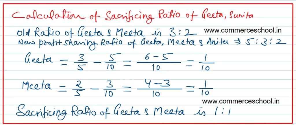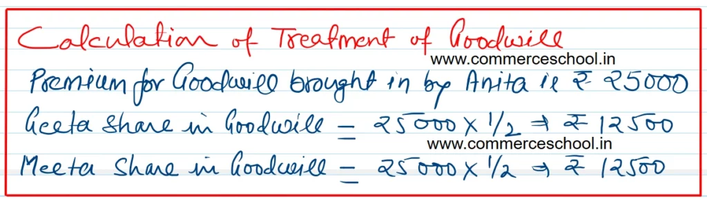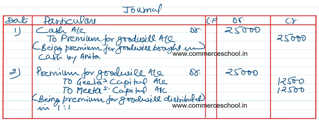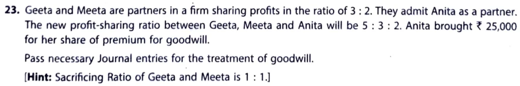 Geeta and Meeta are partners in a firm sharing profits in the ratio of 3 : 2. They admit Anita as a new partner. The new profit sharing ratio between Geeta, Sunita and Anita will be 5 : 3 : 2. Anita brought in ₹ 25,000 for her share of premium for goodwill. Pass necessary Journal entries for the treatment of goodwill.