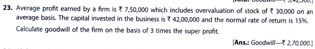 Average profit earned by a firm is ₹ 7,50,000 which includes overvaluation of stock of ₹ 30,000 on an average basis. The capital invested in the business is ₹ 42,00,000 and the normal rate of return is 15%. Calculate the goodwill of the firm on the basis of 3 times the super profit.