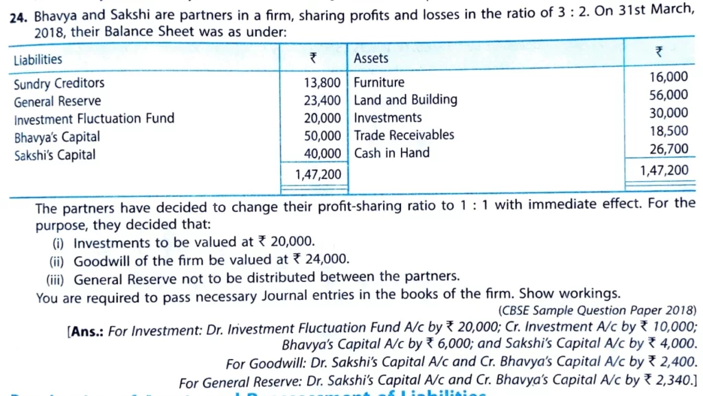 | Sundry Creditors General Reserve Investment Fluctuation Fund Bhavya’s Capital Sakshi’s Capital | 13,800 23,400 20,000 50,000 40,000 | Furniture Land and Building Investments Trade Receivables Cash in Hand | 16,000 56,000 30,000 18,500 26,700 |