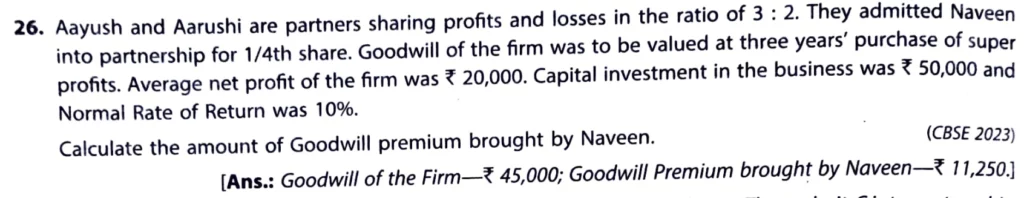 Aayush and Aarushi are partners sharing profits and losses in the ratio of 3 : 2. They admitted Naveen into partnership for 1/4th share. Goodwill of the firm was to be valued at three year’s purchase of super profits. Average net profit of the firm was ₹ 20,000. Capital investment in the business was ₹ 50,000 and Normal Rate of Return was 10%. Calculate the amount of Goodwill premium brought by Naveen.
