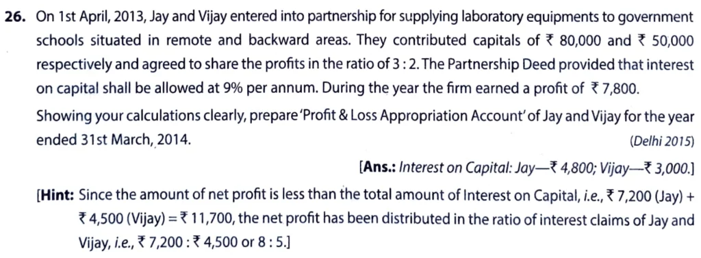 On 1s April 2013, Jay and Vijay entered into a partnership for supplying laboratory equipments to government schools situated in remote and backward areas. They contributed capitals of ₹ 80,000 and ₹ 50,000 respectively and agreed to share the profits in the ratio of 3 : 2. The Partnership Deed provided that interest on capital shall be allowed at 9% per annum. During the year the firm earned a profit of ₹ 7,800.