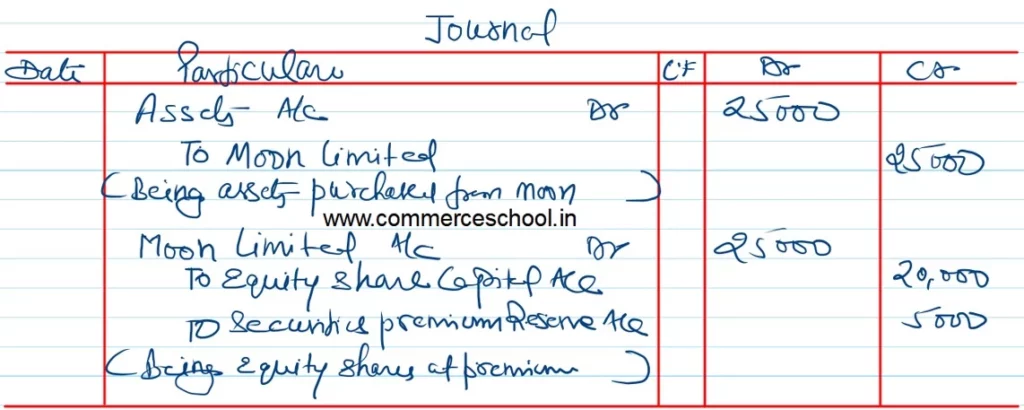 2,000 Equity Shares of ₹10 each were issued to Moon Limited from whom assets of 25,000 were acquired.pass Journal entry.