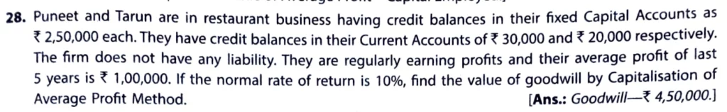 Puneet and Tarun are in the restaurant business having credit balances in their fixed capital accounts as ₹ 2,50,000 each. They have credit balances in their Current Accounts of ₹ 30,000 and ₹ 20,000 respectively. The firm does not have any liability. They are regularly earning profits and their average profit for the last 5 years is ₹ 1,00,000. If the normal rate of return is 10%. Find the value of goodwill by Capitalisation of the Average Profit Method.
