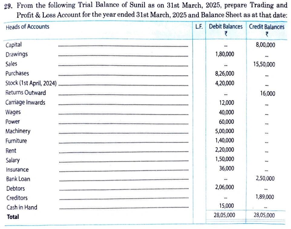 From the following Trial Balance of Sunil as on 31st March, 2025, prepare Trading and Profit & Loss Account for the year ended 31st March, 2025 and Balance sheet as at that date: