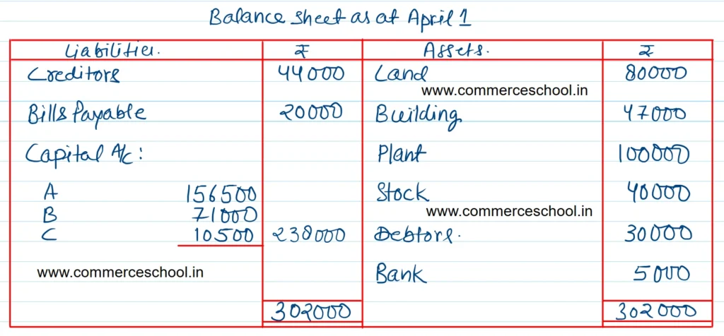 | Creditors Bills Payable General Reserve Capital A/cs: A B C | 50,000 20,000 30,000 1,00,000 50,000 25,000 | Land Building Plant Stock Debtors Bank | 50,000 50,000 1,00,000 40,000 30,000 5,000 |