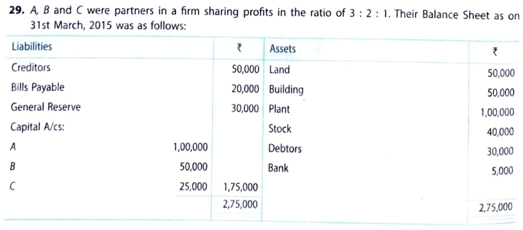 A, B and C were partners in a firm sharing profits in the ratio of 3 : 2 : 1. Their Balance Sheet as on 31st March, 2015 was as follows: