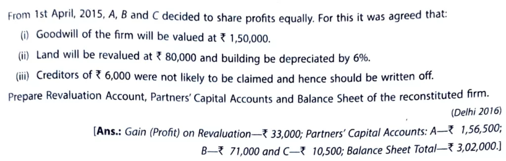 [Ans.: Gain (Profit) on Revaluation – ₹ 33,000; Partner’s Capital Accoufnts: A – ₹ 1,56,000; B – ₹ 71,000 and C – ₹ 10,500; Balance Sheet Total – ₹ 3,02,000.]