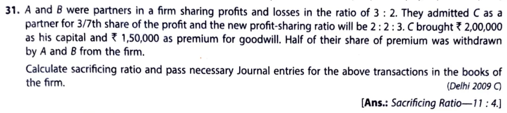 A and B were partners in a firm sharing profits and losses in the ratio of 3 : 2. They admitted C as a new partner for 3/7th share in the profit and the new profit sharing ratio will be 2 : 2 : 3. C brought ₹ 2,00,000 as his capital and ₹ 1,50,000 as premium for goodwill. Half of their share of premium was withdrawn by A and b from the firm. Calculate sacrificing ratio and pass necessary Journal entries for the above transactions in the books of the firm.