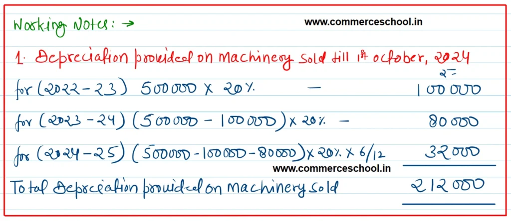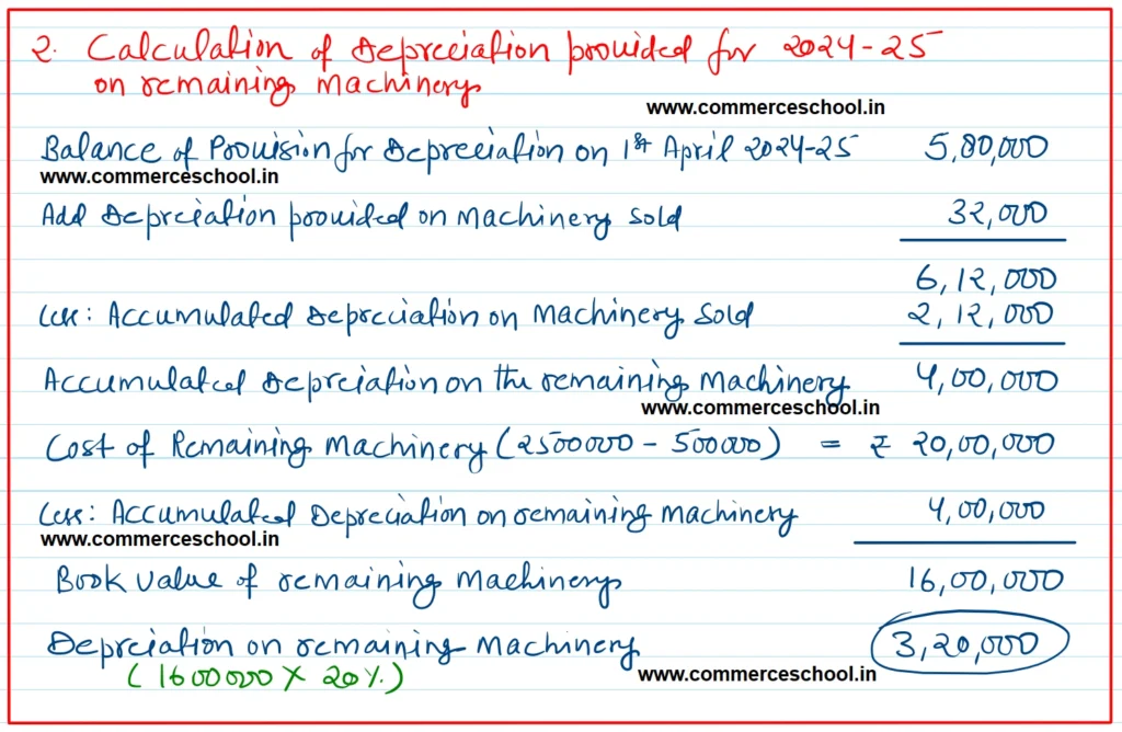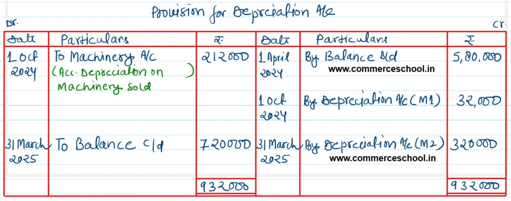 [Ans. Depreciation: 2024-25 – ₹ 3,20,000; Balance of Machinery Account as on 31st March, 2025 – ₹ 20,00,000; Provision for Depreciation Account – ₹ 7,20,000; Gain on Sale of Machinery – ₹ 12,000.]